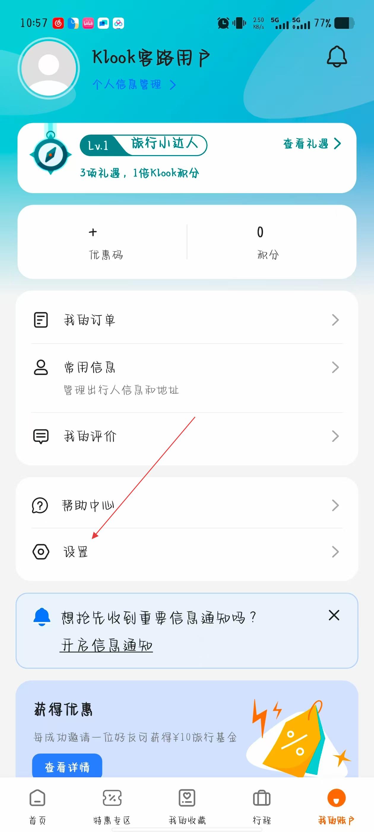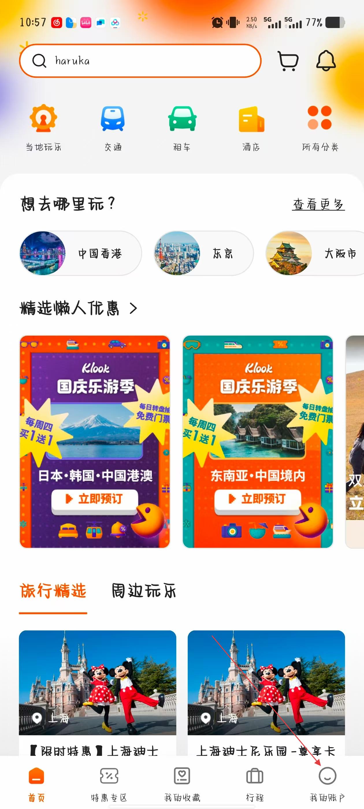 1、打開KLOOK客路旅行APP,點(diǎn)擊頁(yè)面右下角我的圖標(biāo),進(jìn)入個(gè)人中心頁(yè)面。