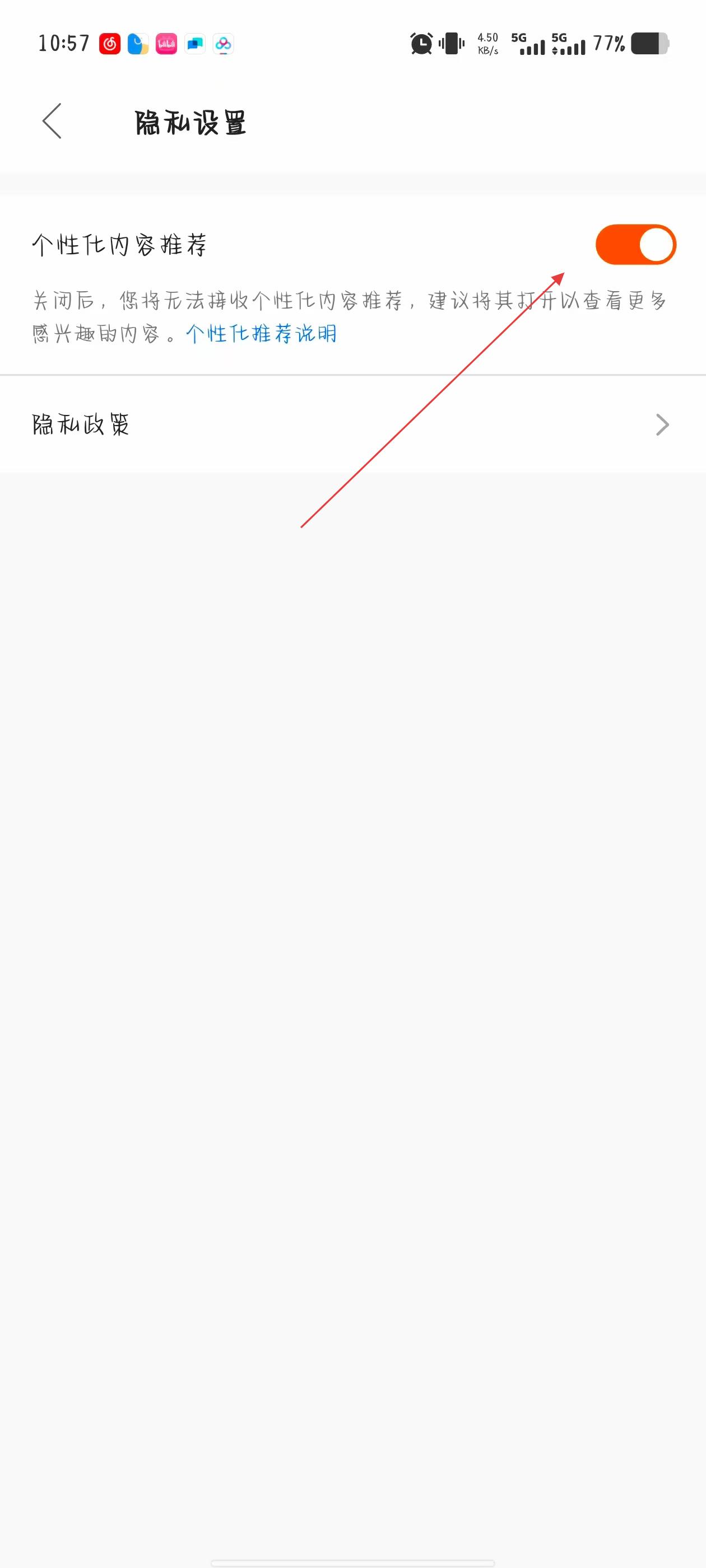4、在隱私與個(gè)性化頁(yè)面中,找到個(gè)性化推薦相關(guān)的開關(guān)按鈕,點(diǎn)擊開關(guān)將其切換為關(guān)閉狀態(tài)。