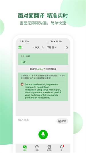 5、多語種翻譯:支持中文、英語、印尼語等多個熱門語言互譯,覆蓋常用語種發(fā)音服務(wù);