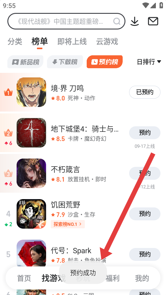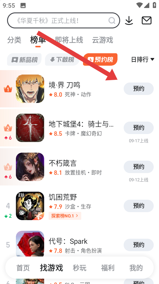 1、進(jìn)入九游找游戲的頁(yè)面,需要切換到榜單-預(yù)約榜,找到想預(yù)約的游戲,點(diǎn)擊右側(cè)預(yù)約的按鈕。