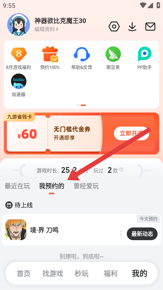 3、若需查看已預(yù)約游戲,可以進(jìn)入我的頁(yè)面,點(diǎn)擊我預(yù)約的標(biāo)簽,即可看到所有已預(yù)約游戲。