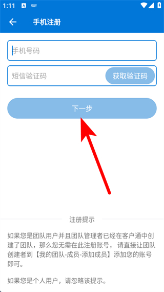 2、在手機(jī)注冊(cè)頁面,輸入手機(jī)號(hào)碼和短信驗(yàn)證碼,點(diǎn)擊下一步。