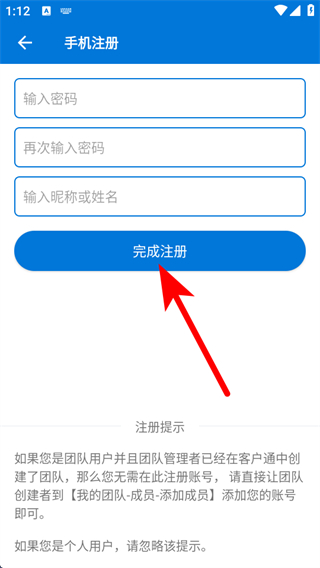 3、設(shè)置密碼,輸入昵稱或姓名,點(diǎn)擊完成注冊(cè),即可完成賬號(hào)注冊(cè)操作。
