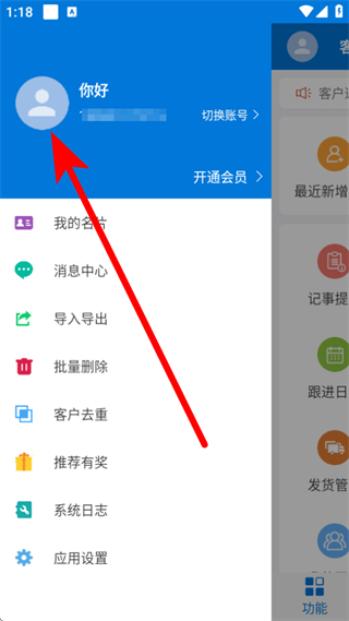 1、進(jìn)入客戶通APP主界面,點(diǎn)擊左上角頭像,展開個(gè)人功能菜單。