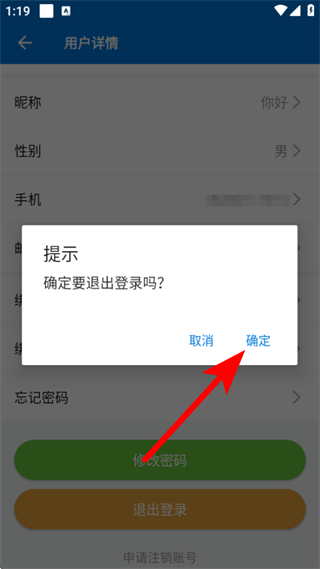 4、在彈出的提示框中,點(diǎn)擊確定,完成退出登錄操作。