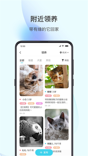 2、可以在社區(qū)中分享自己與寵物的有趣日常,需要領(lǐng)養(yǎng)的也可以在附近領(lǐng)養(yǎng);