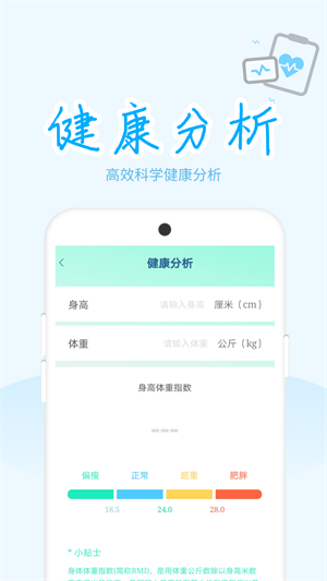 - 用戶可以在這里輸入各種身高和體重的情況,會自動的生成指數(shù)顯示,方便用戶可以查看;