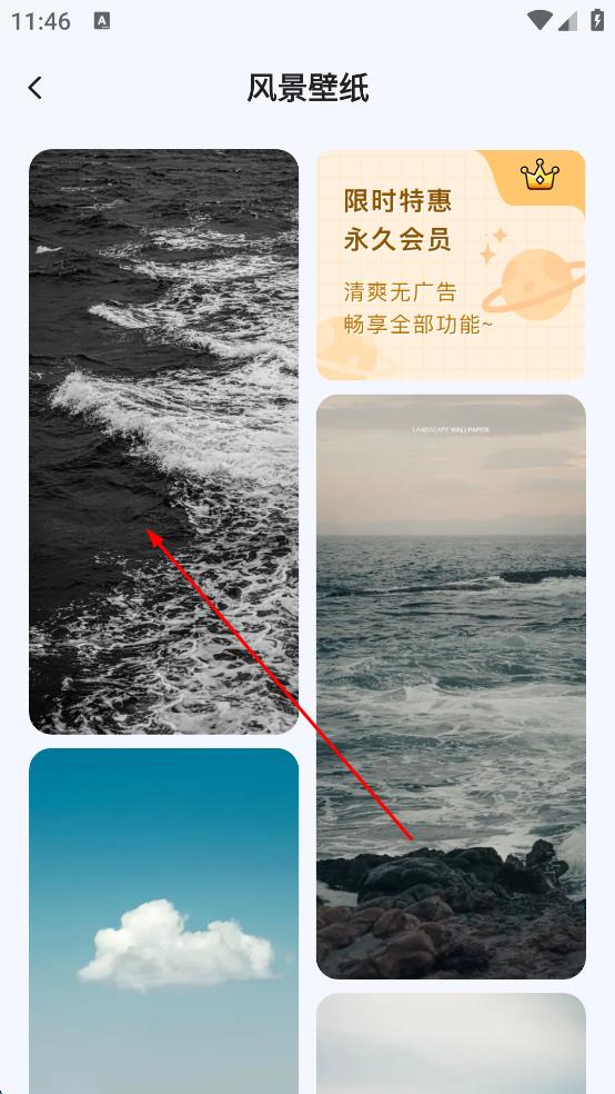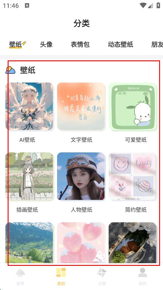 1、打開(kāi)壁紙軟件,進(jìn)入“分類”頁(yè)面,在壁紙分類區(qū)域中,找到并點(diǎn)擊自己感興趣的分類,進(jìn)入該壁紙展示頁(yè)面。