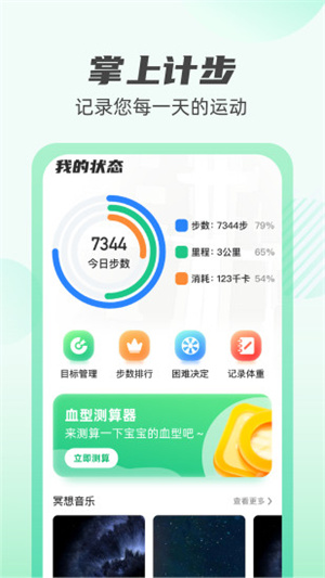 1、【掌上計(jì)步】掌上計(jì)步可以幫助您記錄每天的步數(shù)、里程以及每天消耗了多少卡路里,對(duì)自身運(yùn)動(dòng)情況了如指掌;