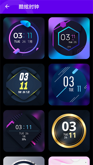 2、時鐘:軟件內(nèi)含四種時鐘模式,包括模擬時鐘,數(shù)字時鐘,酷炫時鐘和自定義時鐘,每一種時鐘內(nèi)又包含多種效果,同時您還可以在時鐘原本的基礎(chǔ)上繼續(xù)進(jìn)行編輯,變成您喜歡的模樣;