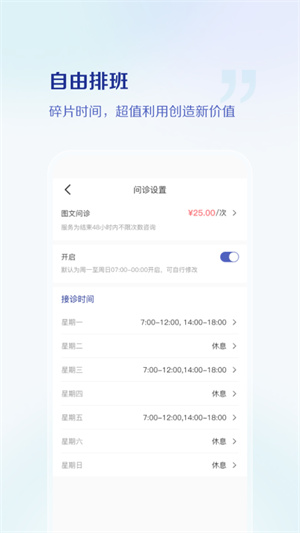 - 自由排班讓大家的碎片時(shí)間也能利用起來,直接線上問診接單賺錢,超值利用,為你創(chuàng)造新價(jià)值。