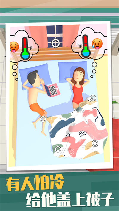 蓋被子游戲?qū)矸浅P蓍e的游戲玩法,玩家需要根據(jù)游戲中的房間溫度去給角色蓋被子,將會帶來非常搞笑魔性的游戲內(nèi)容,并且根據(jù)其中的溫度,拖動被子蓋住角色的身體部分就可以,完成其中的挑戰(zhàn),會有輕松的體驗。