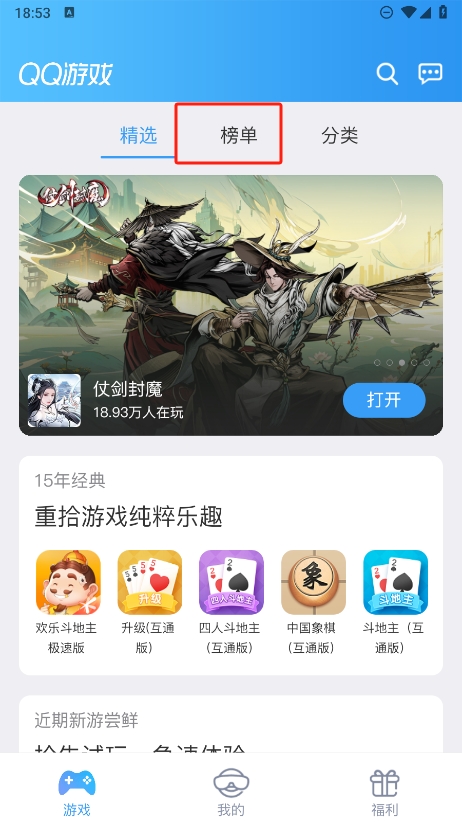 1、進(jìn)入游戲界面可以看到在榜單處找尋最新熱門的游戲,各種經(jīng)典游戲都可以從中找尋;