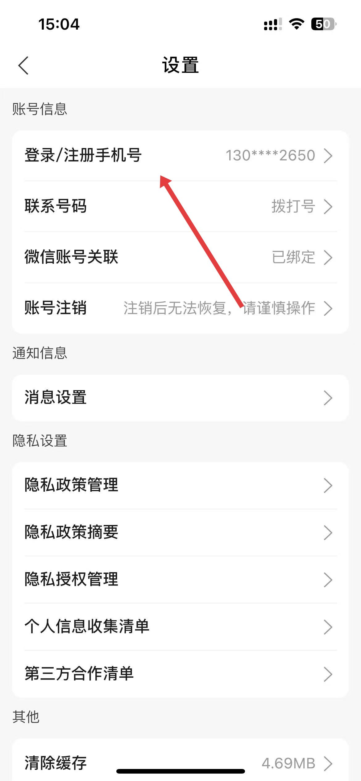 3、在設(shè)置頁面里,找到登錄注冊手機號選項并點擊,進入更換手機號相關(guān)界面。