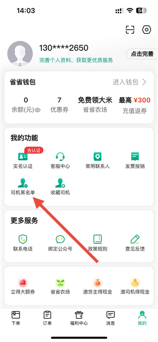 2、在個人中心頁面的我的功能板塊中,找到司機黑名單選項并點擊。