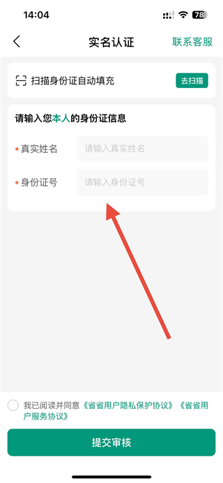 4、在實名認證頁面,輸入真實姓名和身份證號,勾選同意協(xié)議后點擊提交審核完成認證。