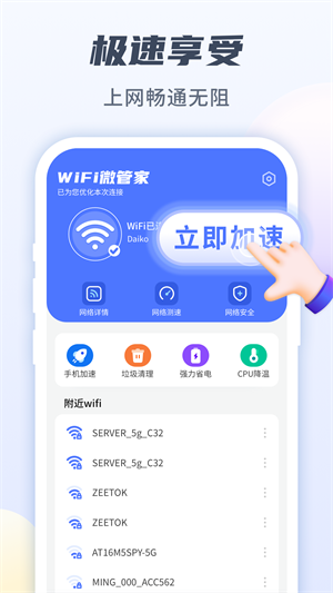 - 一鍵點(diǎn)擊加速WiFi運(yùn)行,讓網(wǎng)速大大提升,極速在線上網(wǎng)沖浪,每天都能暢通無(wú)阻上網(wǎng),輕松上網(wǎng);