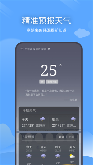 - 全國(guó)城市天氣都能在線查詢到,隨時(shí)切換城市查詢,詳細(xì)展示今明天氣、5天預(yù)報(bào)、15天預(yù)報(bào),更好的出行;