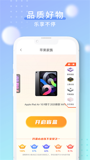 2、【超值主題】APP內(nèi)涵蓋海量超人氣熱門精選好物、手機(jī)數(shù)碼、潮玩手辦、限定玩具、時(shí)尚美妝、生活用品等主題盲盒,選你所愛的主題盲盒,體驗(yàn)在線拆盒的驚喜,超值保底有禮的同時(shí),幸運(yùn)值拉滿,抽歐氣大獎(jiǎng);