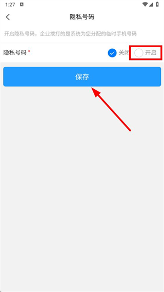 4、在隱私號(hào)碼設(shè)置頁面選擇開啟隱私號(hào)碼,點(diǎn)擊保存按鈕,即可隱藏個(gè)人號(hào)碼。