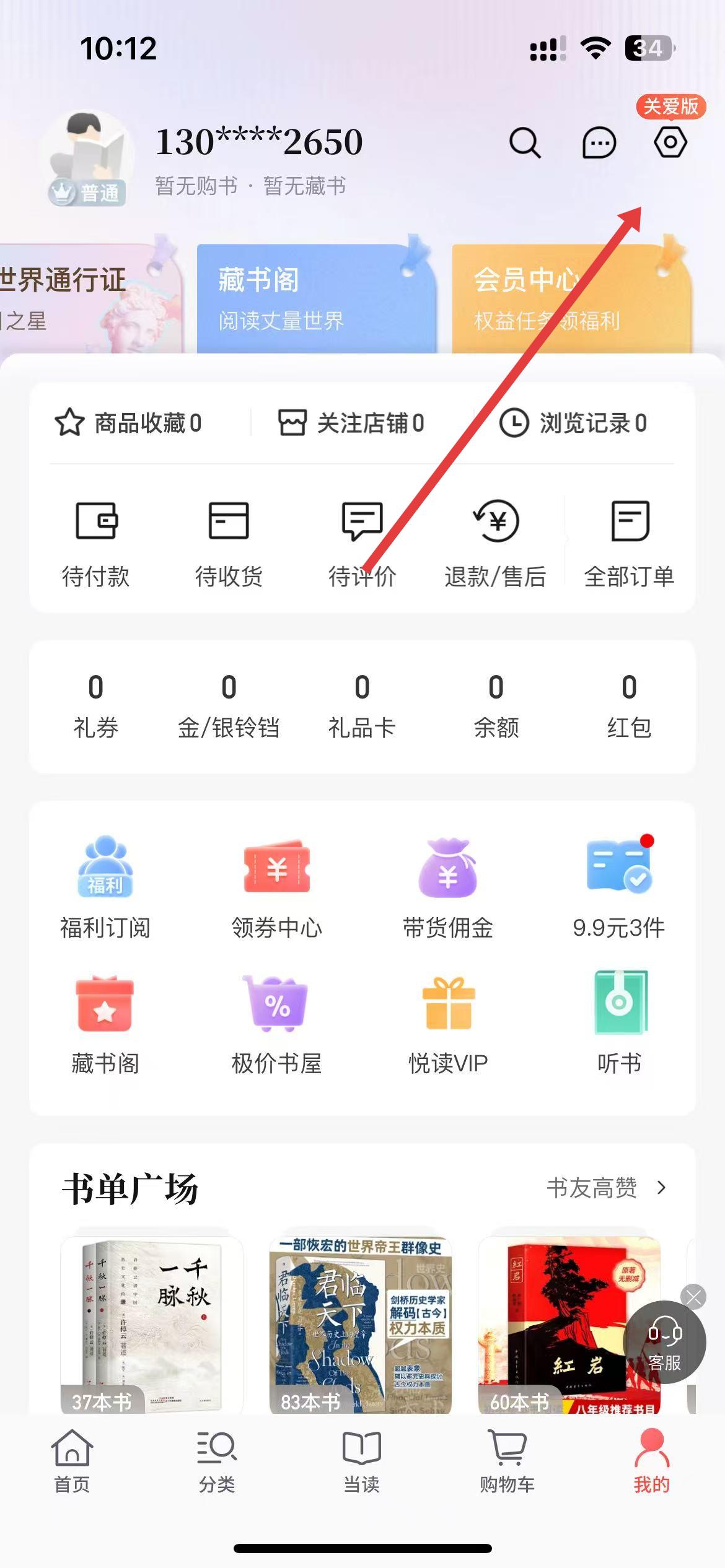 1、打開當當網APP并進入我的界面,在我的界面的右上角點擊設置圖標。