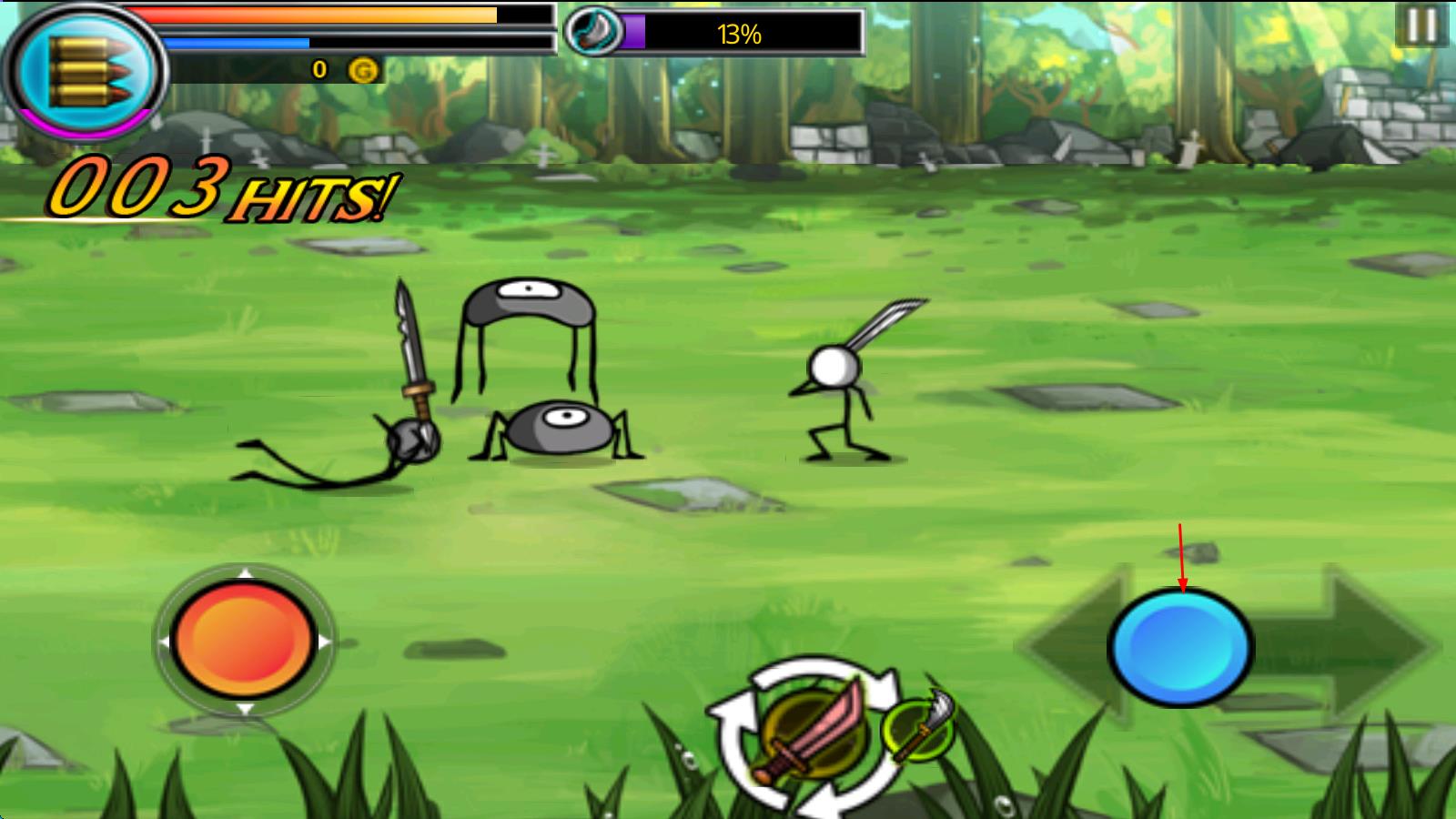 1、進(jìn)入游戲后,先熟悉虛擬按鍵操作,左側(cè)按鍵控制火柴人移動(dòng),右側(cè)按鍵觸發(fā)攻擊,嘗試在初始關(guān)卡消滅基礎(chǔ)敵人,獲取首筆金錢與魔力。