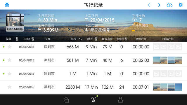 用戶中心界面包括相冊,飛行記錄以及賬戶功能。其中,用戶可通過相冊功能導(dǎo)出相機(jī)SD卡中存放的數(shù)據(jù),飛行記錄保存了飛行數(shù)據(jù),可通過賬戶界面查看DJI賬號(hào)的一些常用信息