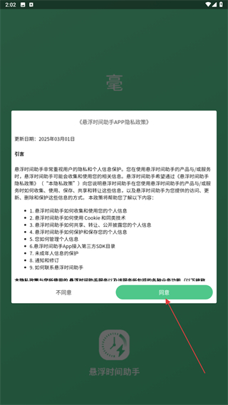 1、打開懸浮時間助手APP,進入時會彈出隱私政策,點擊同意的按鈕。