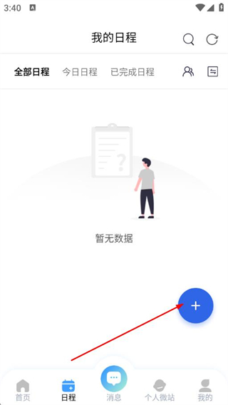 2、在日程頁(yè)面點(diǎn)擊藍(lán)色+,進(jìn)入新建日程頁(yè)面。