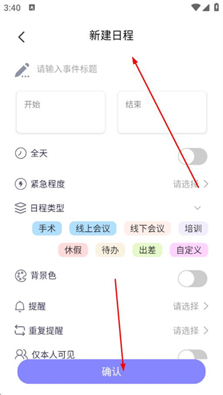 3、在新建日程頁(yè)面填寫信息,點(diǎn)擊確認(rèn),即可添加日程信息。