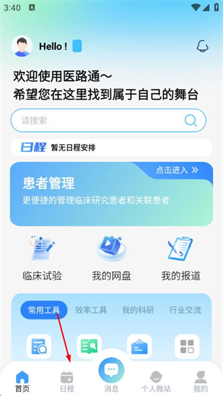 1、打開(kāi)醫(yī)路通APP,點(diǎn)擊底部日程。