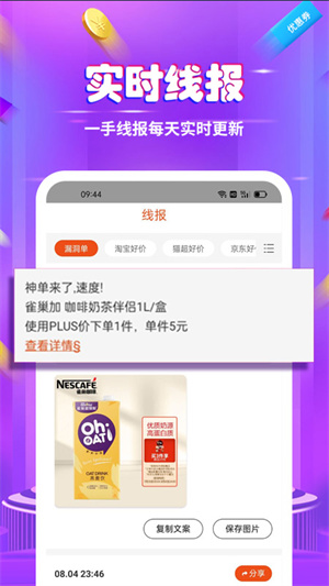 白菜撿漏省錢寶是自用省錢、分享賺錢的綜合網(wǎng)購(gòu)優(yōu)惠應(yīng)用,所有用戶都可以在這里輕松的享受很多的省錢方案,不管是在線上購(gòu)物還是點(diǎn)外賣都是可以省錢的,直接的在這里買東西也是非常的方便,為用戶的日常生活也帶來了很多服務(wù)。