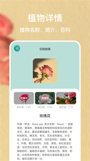 識(shí)別花是手機(jī)上的花草識(shí)別軟件,每個(gè)用戶都能快速掃描識(shí)別花草,簡單的操作快速找到對應(yīng)的百科信息,了解到植物的名字和故事,同時(shí)還有多種相同的植物推薦給大家查看,是大家手機(jī)上的植物百科助手,幫助你輕松識(shí)別植物。