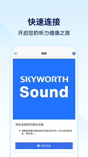 - 開啟手機(jī)藍(lán)牙連接你的助聽器,快速連接綁定,開啟你的聽力健康之旅,更加輕松的用助聽器來聽世界聲音;
