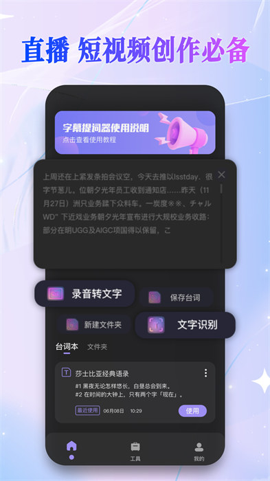 2、【智能錄入】支持圖片、語音智能轉(zhuǎn)臺(tái)字幕,提高用戶的創(chuàng)作效率,贏得時(shí)間成本;
