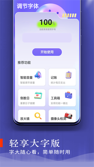 了解輕享大字版是一款致力于提升生活便利性的手機(jī)應(yīng)用,它為用戶提供了多種日常使用的小工具,方便每個(gè)人隨時(shí)獲取所需服務(wù)。無論是日歷、放大鏡、倒數(shù)日提醒,還是實(shí)用的工具箱和攝像頭檢測(cè),這些功能均可免費(fèi)使用,旨在讓每位用戶的生活更加舒適和便利。