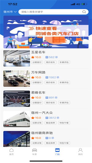 - 自動(dòng)的定位了所有用戶的位置,優(yōu)先為用戶推薦的是附近的汽車門店,幫助用戶在同城找到滿意的商家與車源信息。