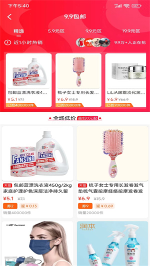 1、9.9包郵專場——低價好物還包郵:人工精選低價好物,人氣爆品低至1元;