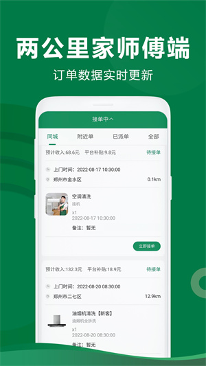 兩公里家?guī)煾刀薬pp是一款專為家庭服務(wù)師傅打造的接單軟件,每個(gè)用戶都可以在線接單賺錢,為自己帶來收益,每天都有超多訂單可以選擇額接單完成,實(shí)時(shí)更新帶來更多的訂單,就近派單讓每個(gè)師傅都有訂單可以賺錢,免費(fèi)入駐隨時(shí)在線賺錢。