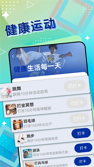 - 各種運動方式都在這里可以使用,跳舞、冥想、羽毛球、跑步、足球、游泳、乒乓球等多款運行方式;