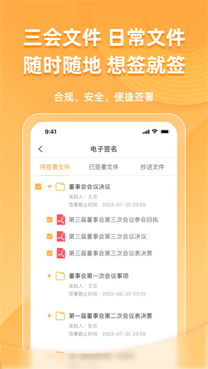 2、合規(guī)、安全、高效的電子簽名功能,實(shí)現(xiàn)三會(huì)文件、日常文件在線簽署;