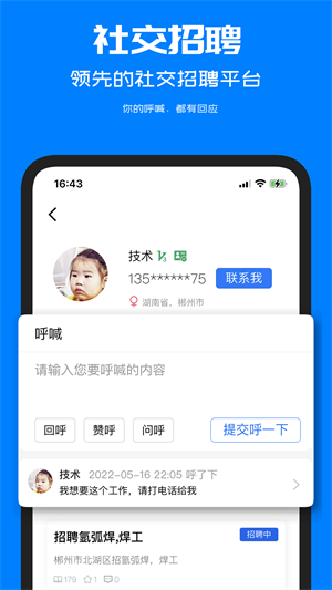 呼工為用戶提供了一個可以直接聯(lián)系找工企業(yè)的渠道,大家都是可以輕松的在線進行聊天,有需要的用戶也是可以免費的直接在線找到工作,還可以跟企業(yè)進行電話溝通,在這里的所有工作信息可以保障都是真實的內(nèi)容,讓用戶可以更放心。