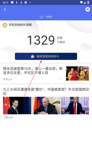 2、檢測完成后會顯示手機系統(tǒng)碎片清理界面,若檢測到碎片,點擊繼續(xù)清理系統(tǒng)碎片進入詳細的碎片清理界面。