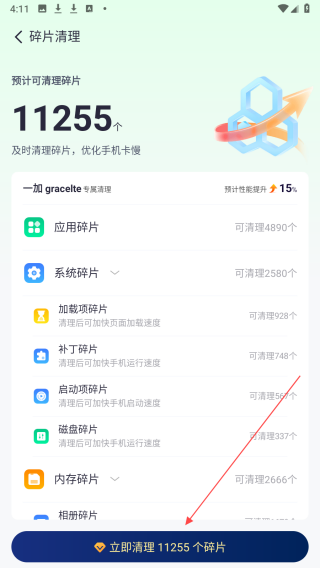 3、在碎片清理界面能看到應用碎片、系統(tǒng)碎片等不同類型的碎片及預計可清理數(shù)量,確認后點擊“立即清理”按鈕,即可清理檢測出的垃圾碎片,優(yōu)化手機性能。