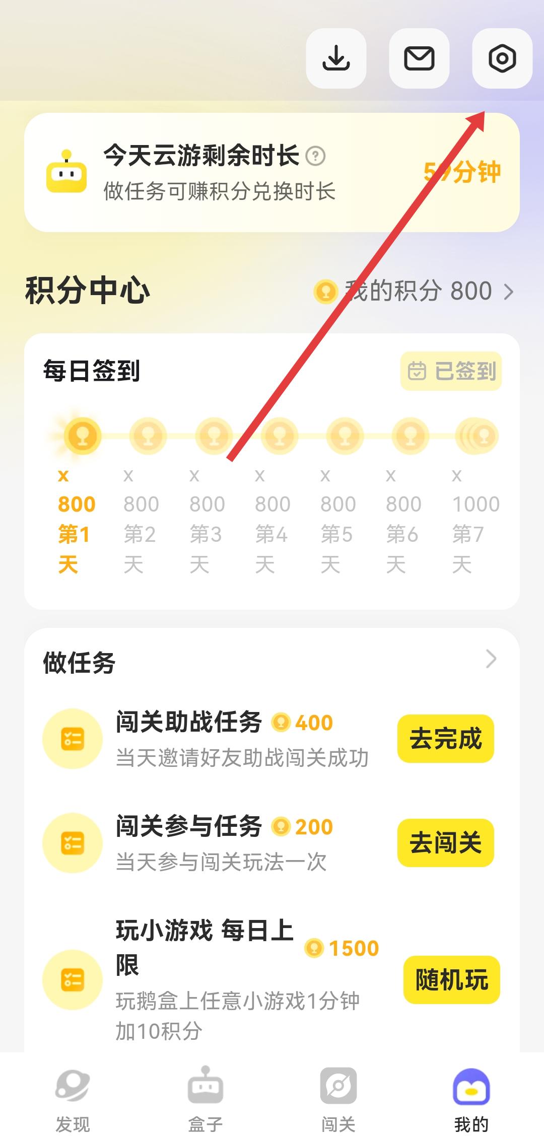 1、進(jìn)入鵝盒我的頁面后,需要點(diǎn)擊右上角的設(shè)置圖標(biāo),進(jìn)入賬號設(shè)置的界面。