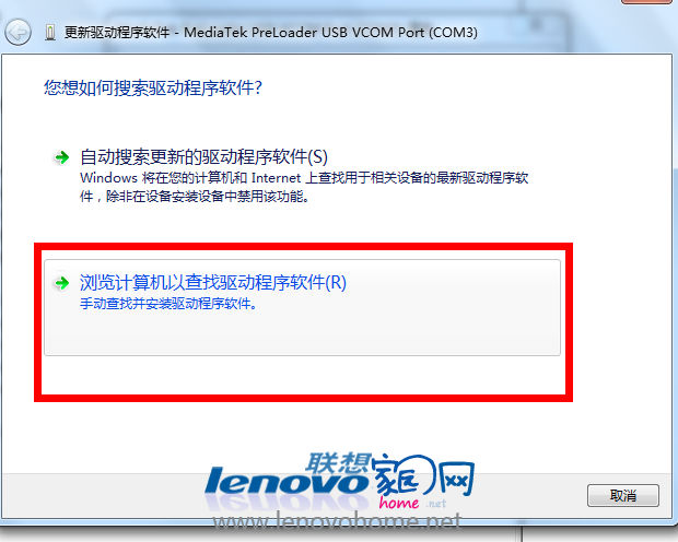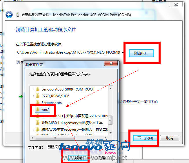 3、如果你的電腦是win7系統(tǒng)電腦,需要在設(shè)備管理器出現(xiàn)MT65xx感嘆號驅(qū)動的時候,手動雙擊它,并選擇“驅(qū)動程序---更新驅(qū)動程序----瀏覽計(jì)算機(jī)以查找驅(qū)動程序軟件-----瀏覽------選擇對應(yīng)的驅(qū)動文件夾---下一步----始終安裝---安裝完成”,如圖: