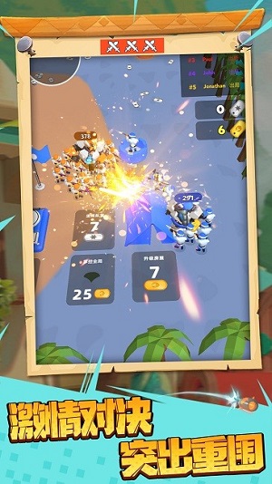 王國戰(zhàn)爭模擬器玩家扮演島上總指揮官,需要就地建立兵營和快速招募士兵,通過游歷四方撿取金銀財寶,升級武器和兵營防御力,從而擊退敵軍士兵和攻打敵軍兵營。
