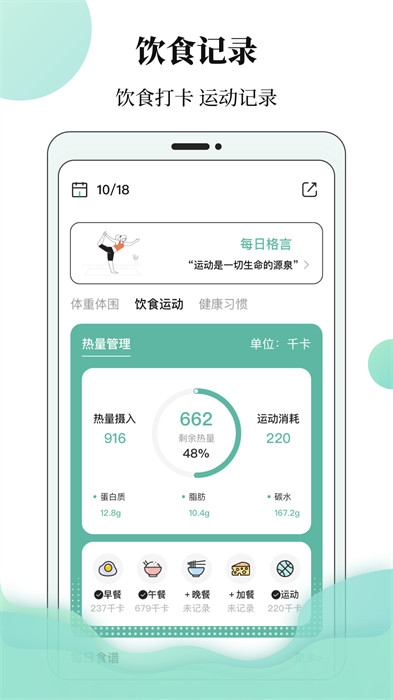 1、【記體重】建立身體檔位,記錄體重、體型、體圍,清晰地展示目標(biāo)體重和減肥目標(biāo),讓你更快更好地進(jìn)行減肥打卡計(jì)劃;