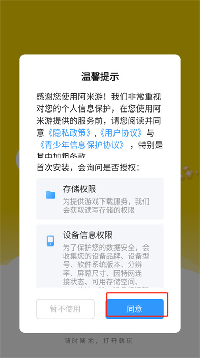 1、大家需要提前通過本站下載阿米游app軟件,并直接點擊進入,可以談到隱私安全同意項目,點擊【同意】即可進入,如下圖所示;