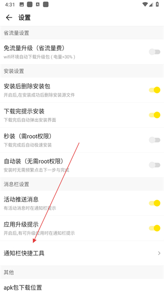 2、在設置頁面中,找到并點擊通知欄快捷工具選項。